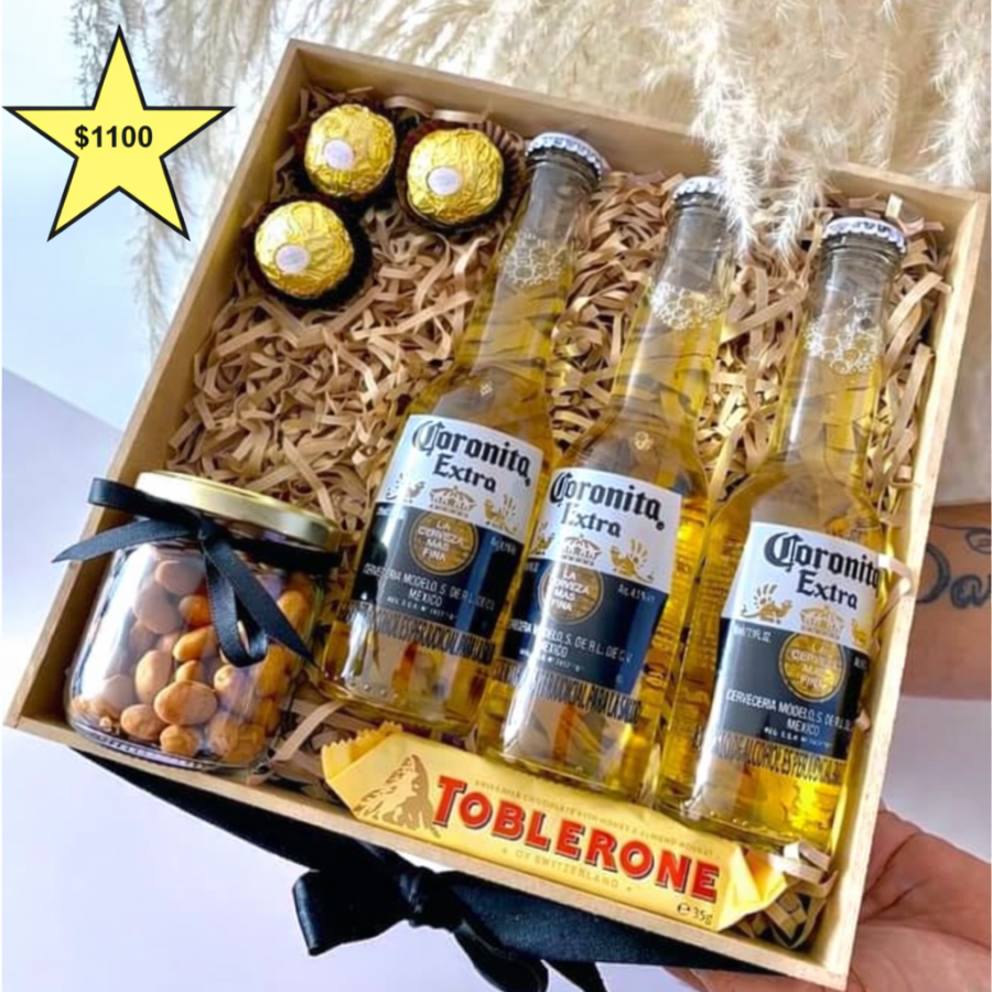 La caja incluye tres cervezas Coronita Extra, ideales para brindar y acompañar una charla relajada; chocolates seleccionados que aportan el toque dulce y elegante —perfectos para cerrar la noche— y frutos secos presentados en frasco, que suman textura y contraste para un picoteo equilibrado. Todo viene dispuesto en una caja de madera, con relleno decorativo y terminaciones prolijas, lista para regalar sin necesidad de envolver.