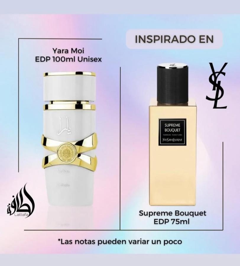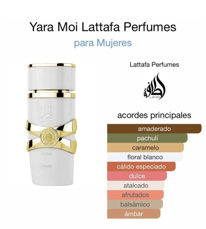 En el fondo, aparecen notas de pachulí y sándalo, que le brindan un acabado más maduro y sofisticado, logrando que la fragancia mantenga su dulzura pero con una base estable y sedosa. Gracias a esta combinación, Yara Moi mantiene un aroma persistente, femenino y muy agradable durante varias horas.