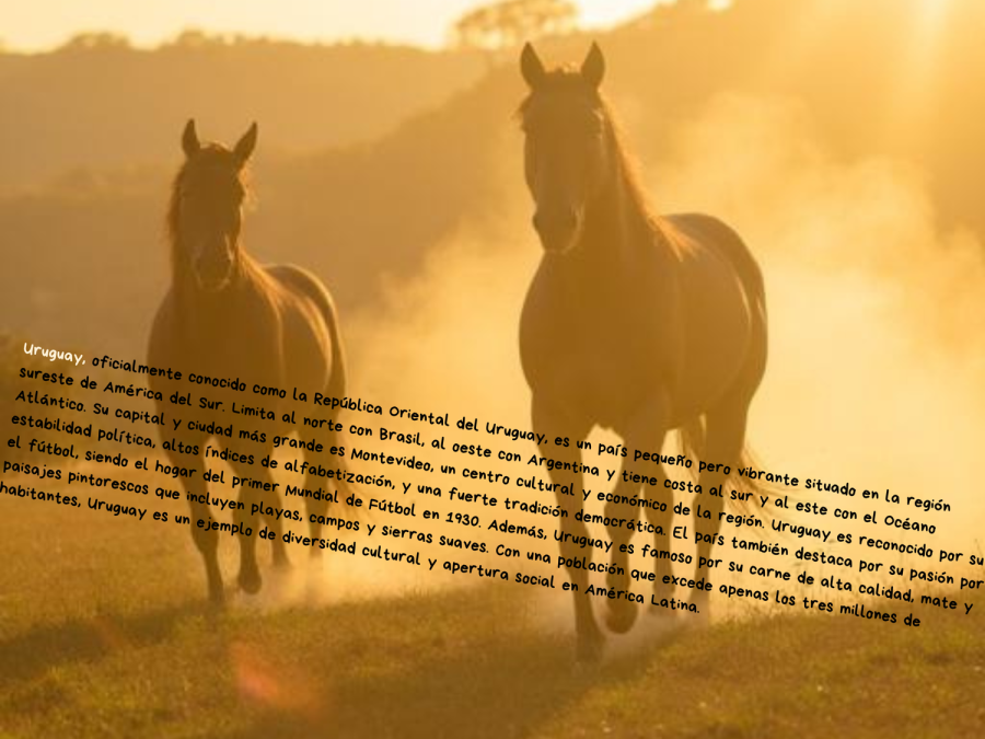 Sobre la imagen, letras negras cruzan la composición con información básica del Uruguay, aportando un contraste moderno y un mensaje identitario sin perder elegancia.