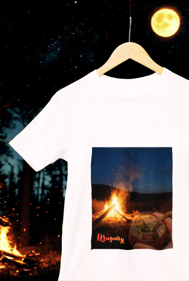 El diseño muestra una fogata campestre bajo un cielo estrellado, creando una atmósfera íntima y serena. En primer plano, paisano ceba un mate, símbolo profundo de encuentro, pausa y tradición uruguaya.