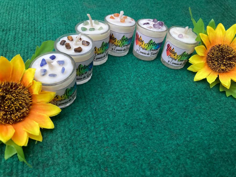 Cada cristales tienen su propiedad y beneficios a cual con la vela brinda una energía positiva. Cada vela es única junto con cada piedrita. Tenemos para ti elección: Amatista, Cuarzo Rosa, Ojo de Tigre, Onix, Cornalina Jaspe Rojo y más