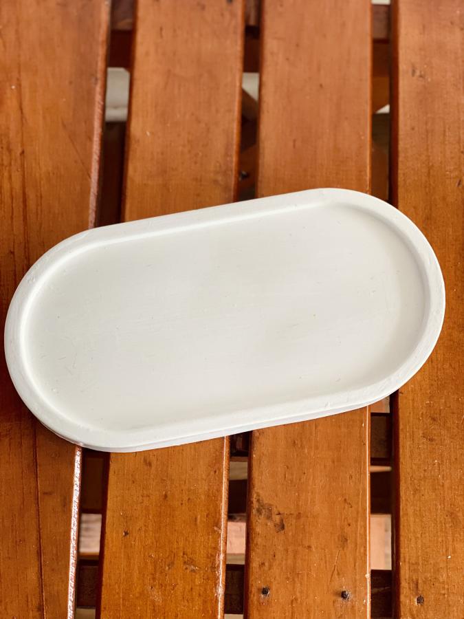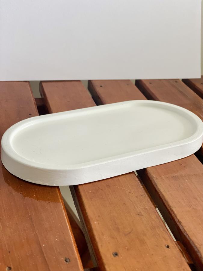 Bandeja ovalada minimalista. Pieza moderna e irrepetible, ideal como base elegante para tus sets de velas o articulos personales. Material: Mezcla de yeso y cemento de alta resistencia. Medidas: 18 x 9 x 1 cm. Sellada y barnizada