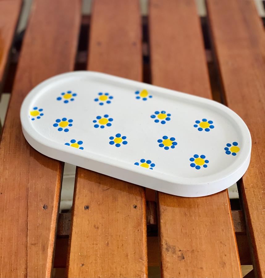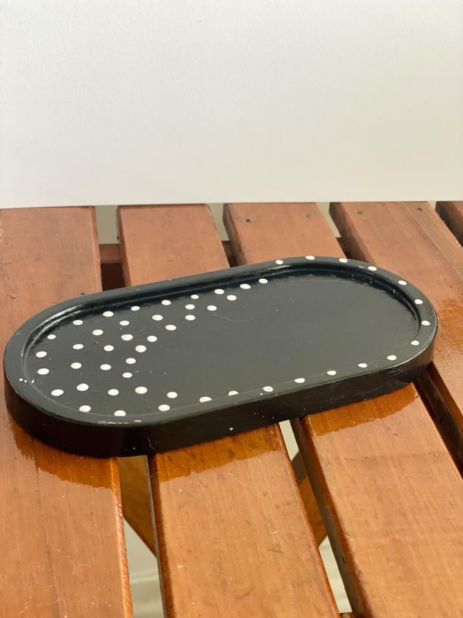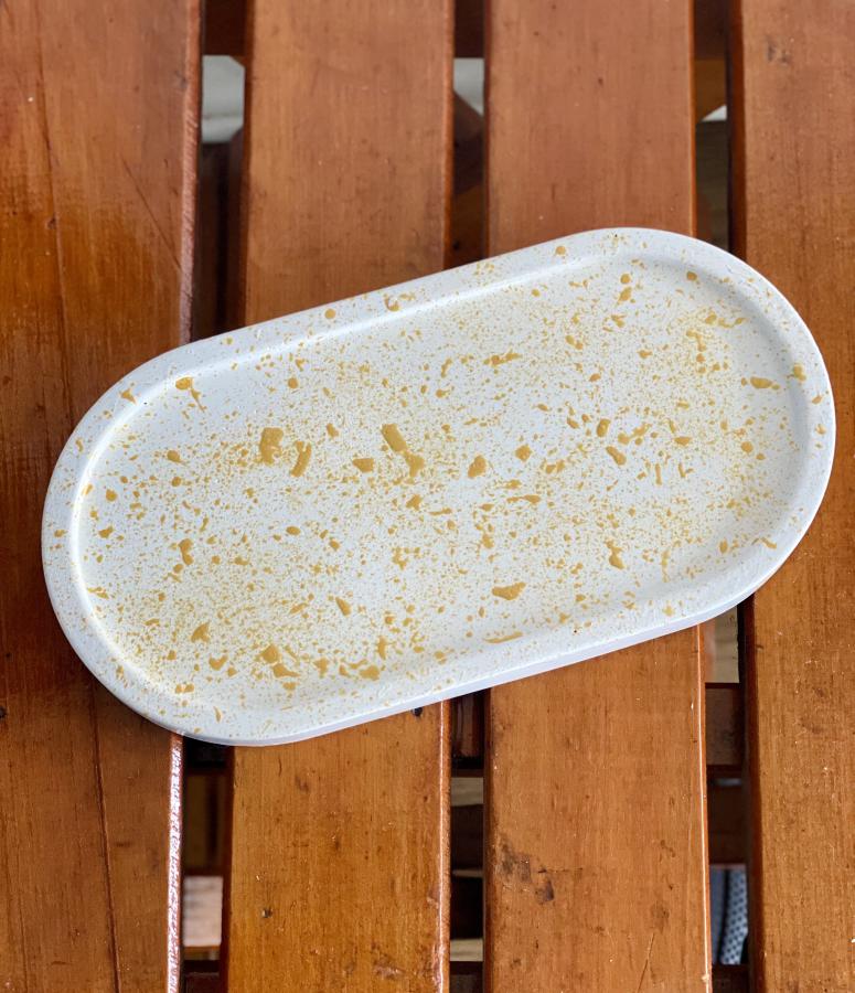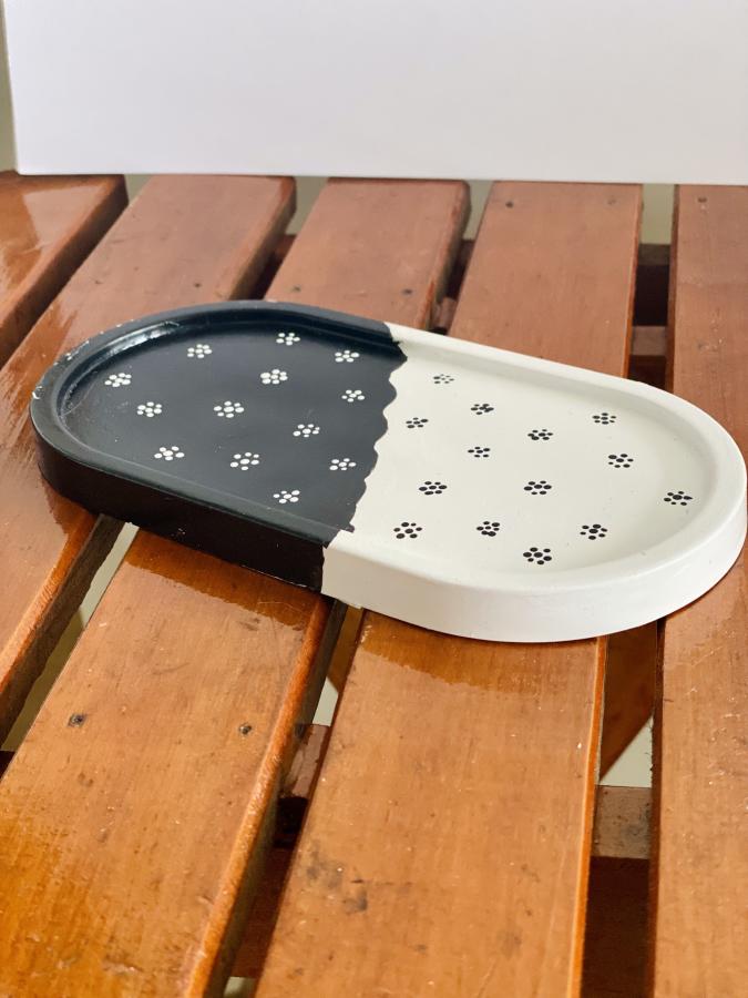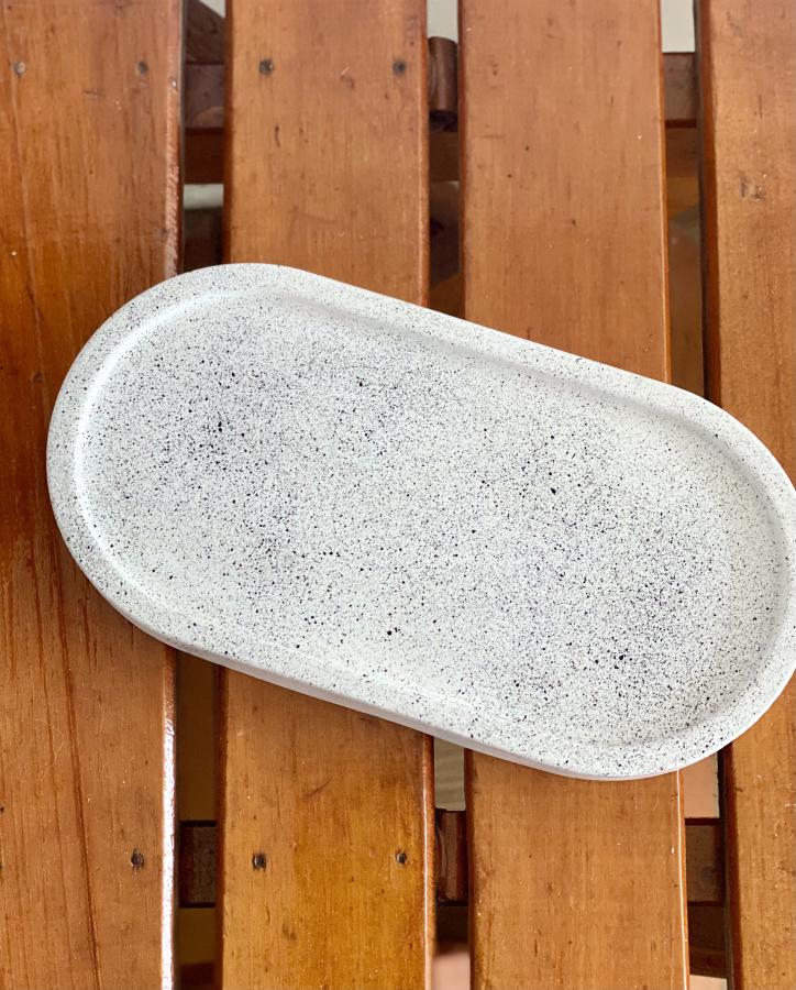 Bandeja ovalada minimalista. Pieza moderna e irrepetible, ideal como base elegante para tus sets de velas o articulos personales. Material: Mezcla de yeso y cemento de alta resistencia. Medidas: 18 x 9 x 1 cm. Sellada y barnizada