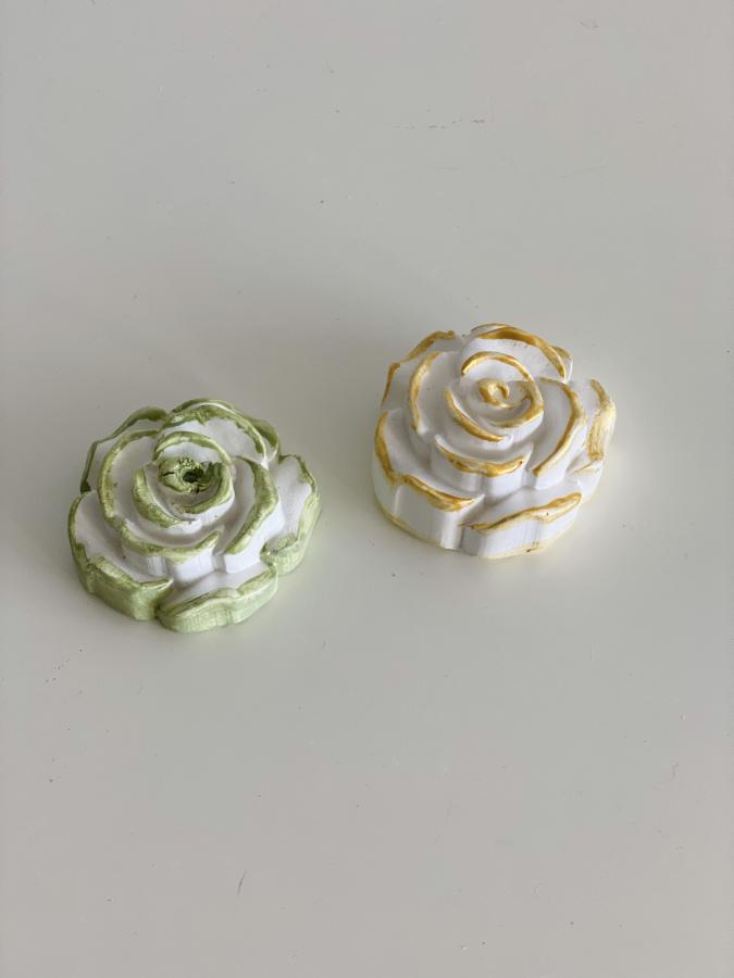 Rosa de Aroma: Difusor Recargable. Forma elegante de perfumar tu espacio sin llama. Absorbe y dispersa aceites esenciales. Material: Yeso y cemento de alta absorción. Medidas: Diámetro 6 cm x Alto 2.5 cm. Sellada y Barnizada.