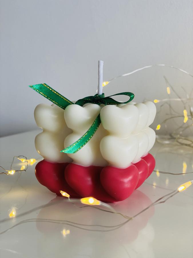 Vela Corazón Bubble. Diseño de burbujas moderno y festivo. Delicado y perfecto para regalar. Una pieza que combina lo tierno con lo decorativo. Material: Cera de soja. Medidas: 6.5 cm x 6.5 cm x 6.5 cm.
