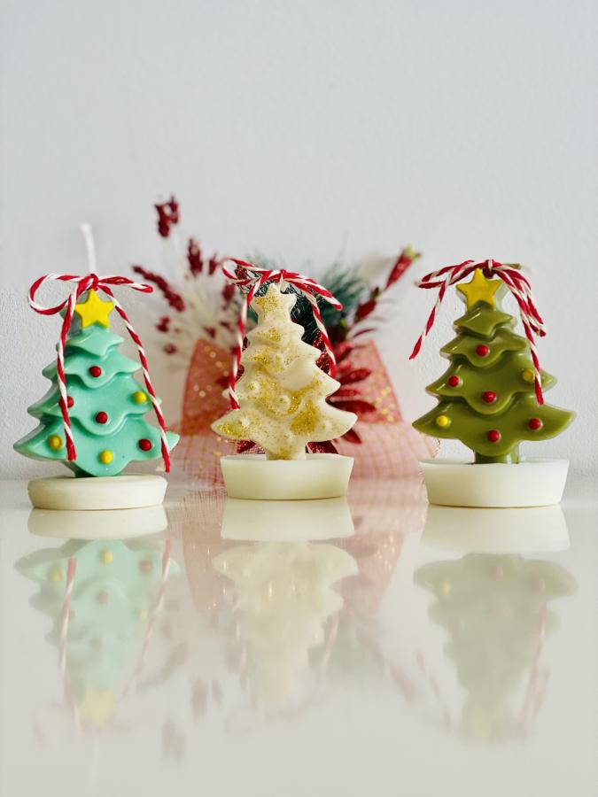 Vela Árbol de Navidad con base. Vela de molde para colgar o decorar. Árbol que simboliza la unión familiar, llenando tu hogar de magia navideña. Material: Cera de soja. Medidas: Alto 9 cm x Ancho 6 cm x Profundidad 5.5 cm