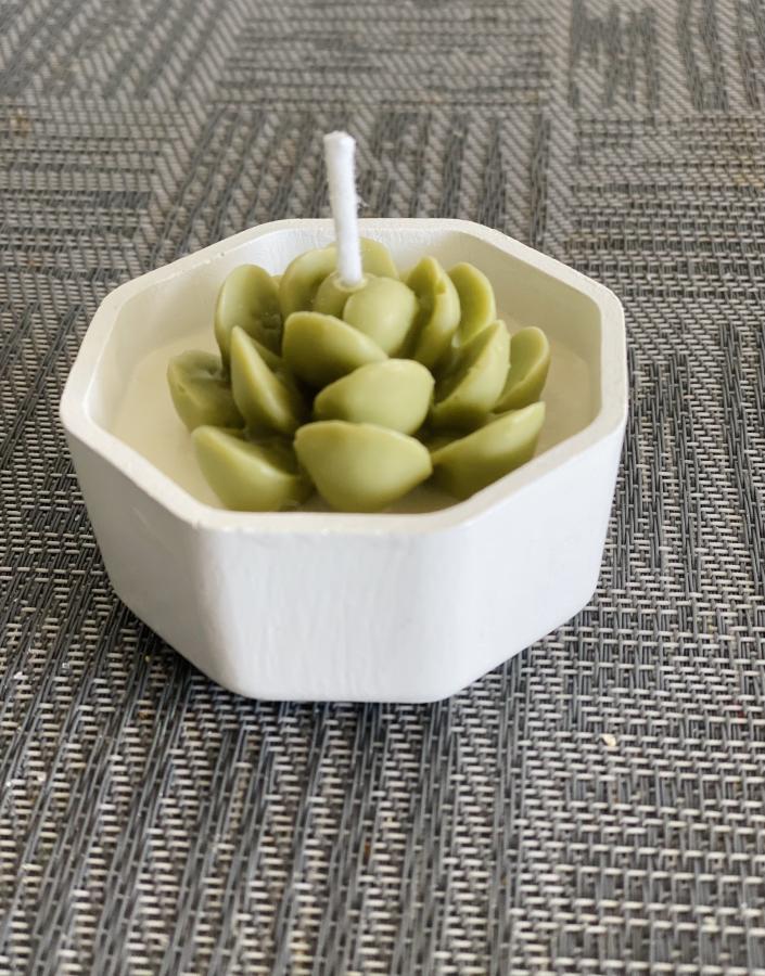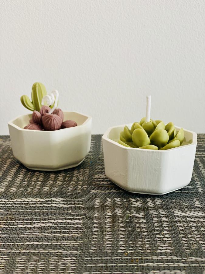 Maceta y Tunas. Diseño botánico que decora y aromatiza. Tunas de cera en maceta de yeso y cemento. Material: Yeso, cemento y Cera de soja. Medidas: Diámetro 6.5 cm x Alto 4.5cm.