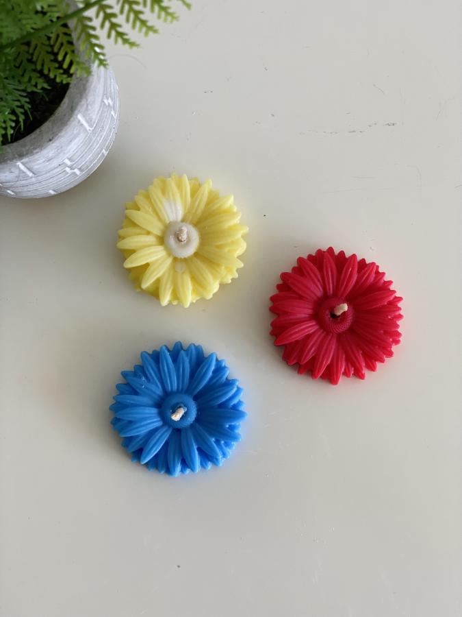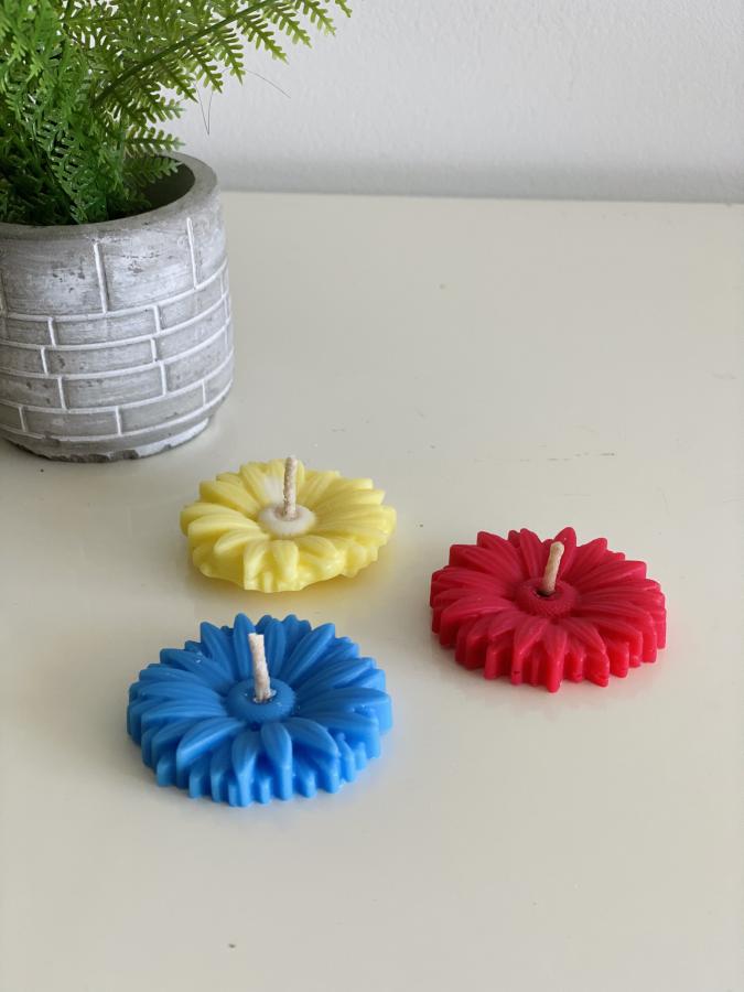Vela Margarita pequeña. Pequeña margarita de vela, perfecta para detalles sutiles o para complementar tu espacio. Material: Cera de soja. Medidas: Diámetro 4.5 cm x Alto 0.5 cm.