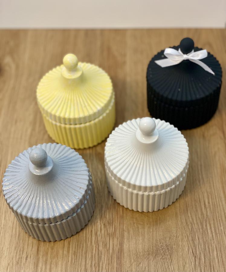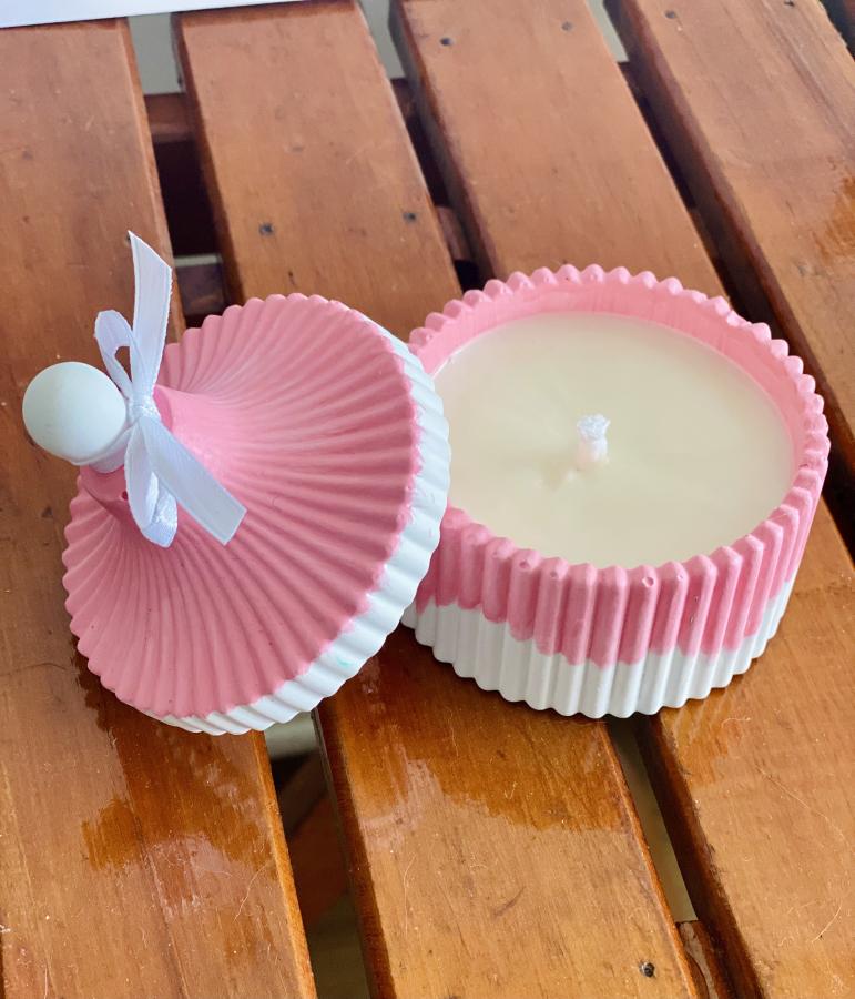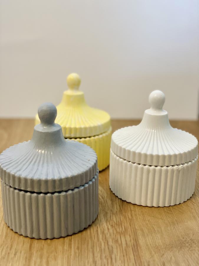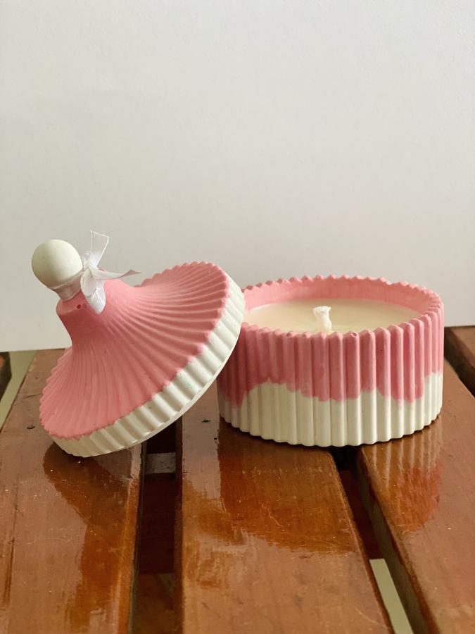 Vela Circus. Diseño minimalista. El recipiente de yeso y cemento contiene una vela de cera de soja. Al consumirse, la base es reutilizable. Material: Yeso/Cemento y Cera de soja. Medidas: Diámetro 8 cm x Alto 3.5cm.