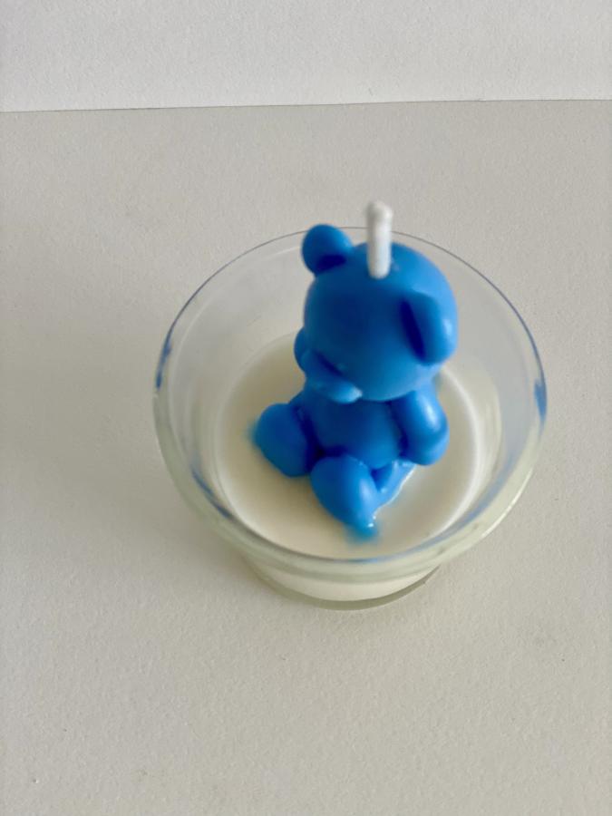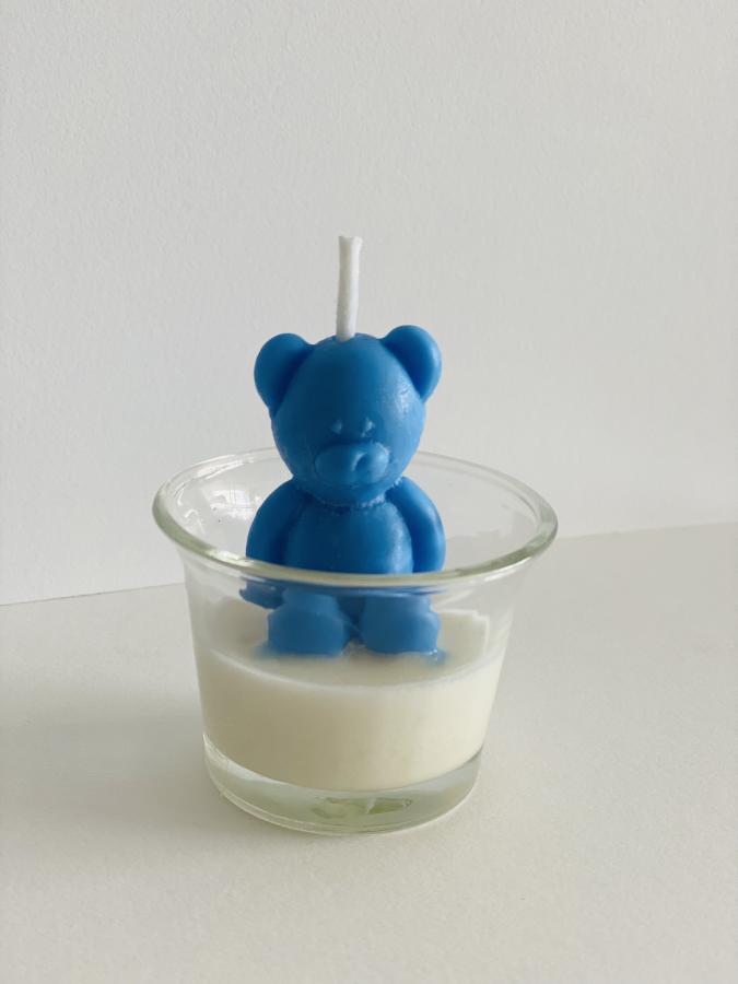 Vela Oso teddy en recipiente vidrio. Tierna vela decorativa. Ideal para souvenirs. En vaso de vidrio reutilizable. Material: Vidrio y Cera de soja. Medidas: Diametro 6cm x Alto 7 cm.