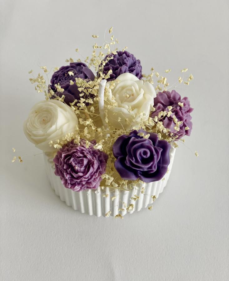 Set Circus Bouquet. Base de yeso y cemento con un ramillete de velas florales. Un regalo impresionante y lleno de estilo. Material: Yeso/Cemento y Cera de soja. Medidas: Base 10 cm x 8cm. Aprox 8 flores por bouquet