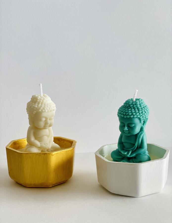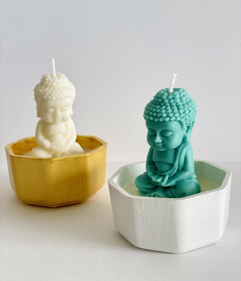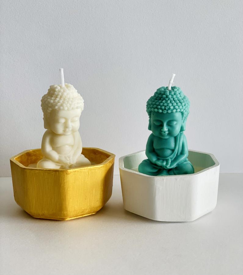 Set Maceta + Vela Buda. Vela en recipiente de yeso y cemento con una figura de Buda de cera. Un set para la relajación y meditación. Material: Yeso/Cemento y Cera de soja. Medidas: Maceta 6.5 cm x Alto 8cm.