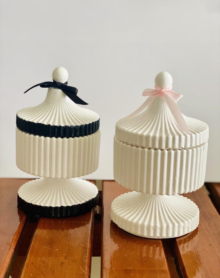 Circus con pie. Vela vertida en recipiente tipo copa. Al terminarse, el recipiente de yeso y cemento se convierte en un alhajero único. Material: Yeso/Cemento y Cera de soja. Medidas: Diámetro 8 cm x Alto 13.5cm.