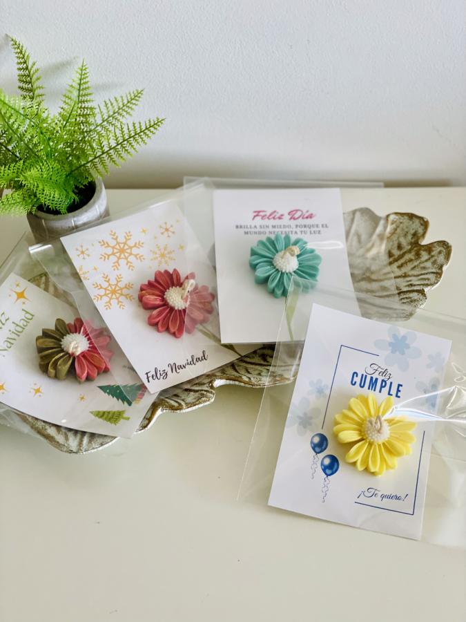 Tarjeta Margarita. Detalle artesanal único que combina la delicadeza floral con el espíritu de cualquier celebración que tú tengas, añadiendo un recuerdo elegante. Material: Cera de soya y tarjeta de papel. Medidas: 10 cm x 15 cm