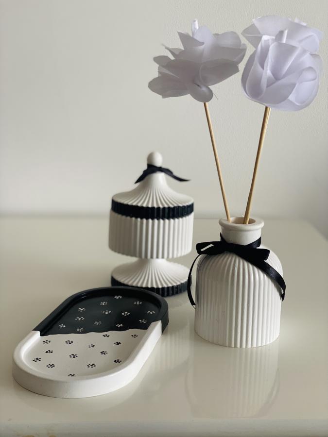 Bandeja ovalada, Alhajero Copa sin vela, Florero con Flores de tela. El trío sofisticado de yeso y cemento que transforma tu tocador en algo muy especial. Solución de decoración completa y elegante. Material: Yeso, Cemento