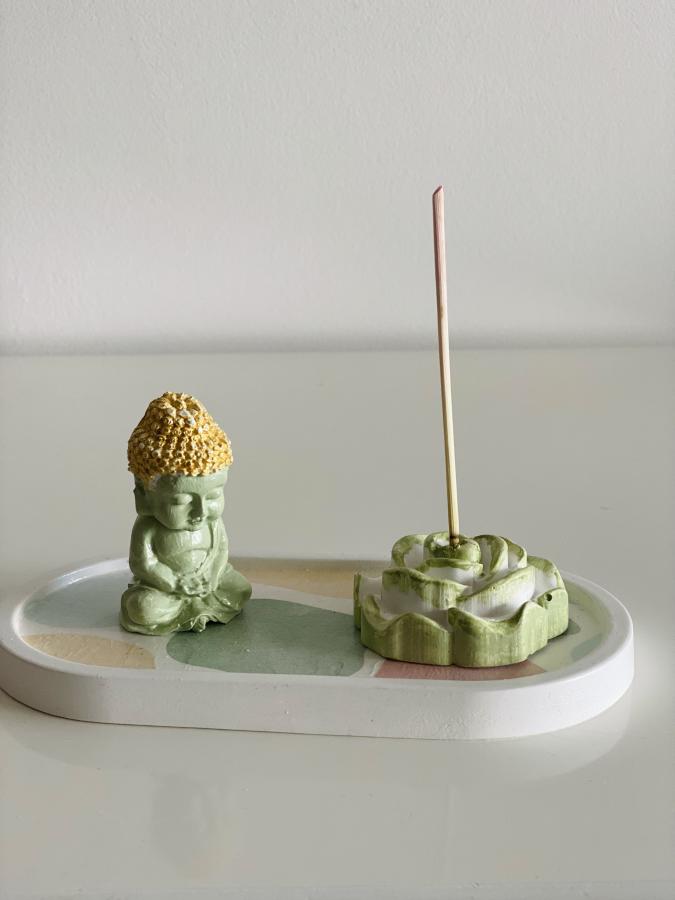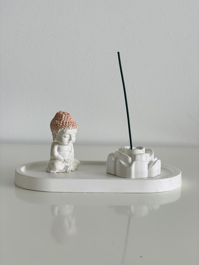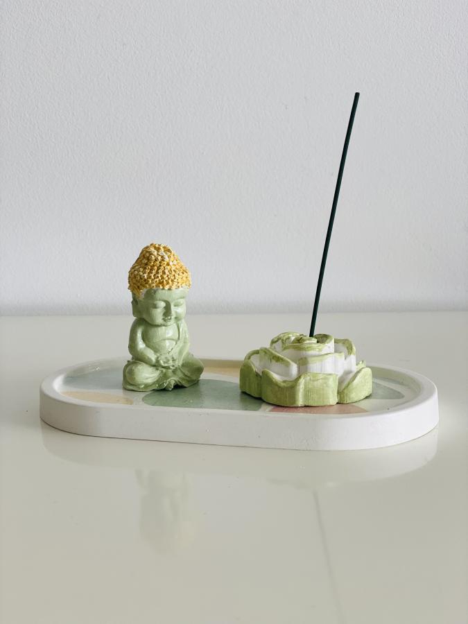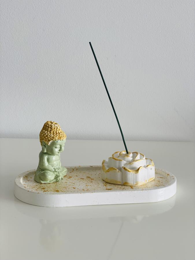 Bandeja ovalada, figura de Buda y Rosa de yeso/cemento con sahumerio. El regalo perfecto que combina calma y afecto. Material: Yeso y Cemento. Medidas: Bandeja 18 cm.