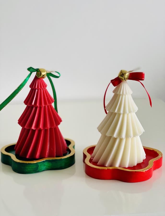 Bandeja con forma de Flor y vela Árbol de Navidad. La transición perfecta entre otoño e invierno. Material: Yeso y Cera de soja. Medidas: Bandeja 18 cm.