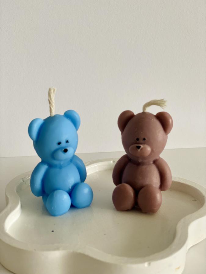 Bandeja con forma de Flor con 2 velas Osito Teddy. Un regalo tierno para baby showers o cualquier ocasión. Material: Yeso y Cera de soja. Medidas: Bandeja 18 cm.