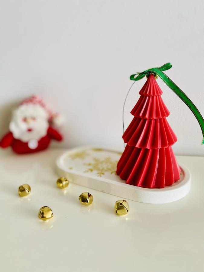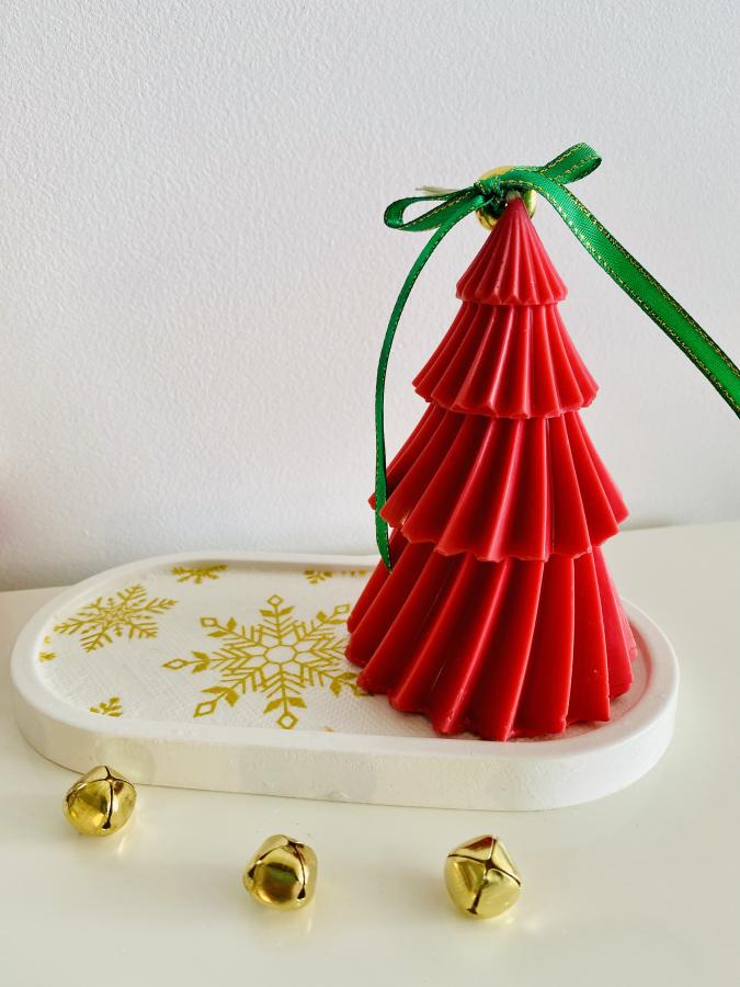 Bandeja ovalada y 1 vela Árbol de Navidad. Ideal para mesas de luz o como regalo navideño. Material: Yeso y Cera de soja. Medidas: Bandeja 18 cm.