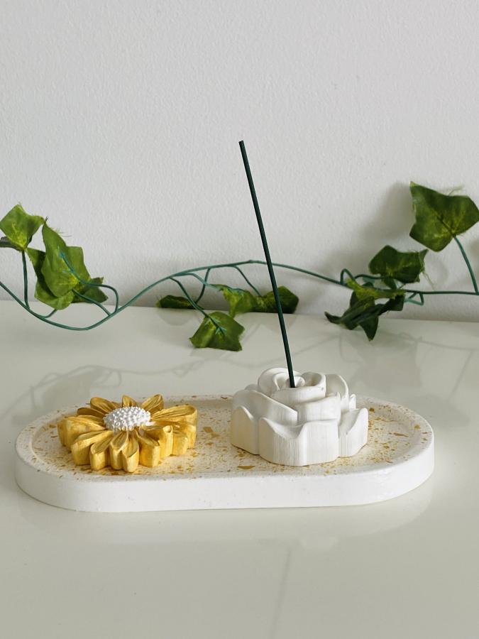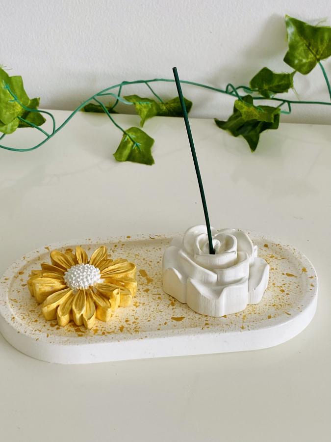 Bandeja de diseño, rosa, sahumerio y margarita difusora. La experiencia artesanal completa para crear un rincón multisensorial de calma. Material: Yeso, Cemento y Sahumerio. Medidas: Bandeja 18 cm.