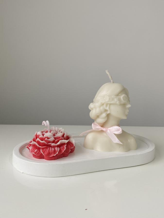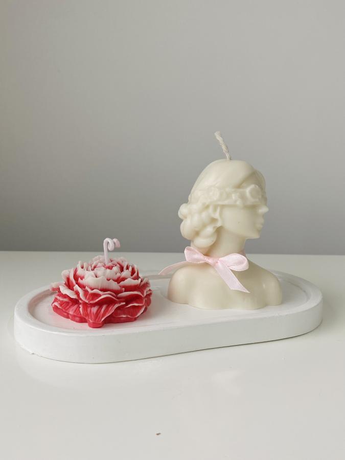 Bandeja con vela flor peonia y vela de diseño mujer con antifaz. Material: Yeso, cemento y cera de soja. Un toque de sofisticación para cualquier rincón
