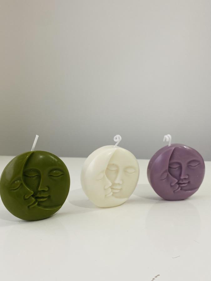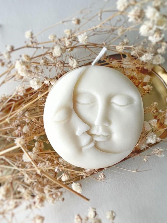 Diseño místico que une ambos astros. Medidas: 6.5 cm diámetro x 1.5cm alto. Material: cera de soja artesanal. Equilibrio y luz para tu espacio. ✨