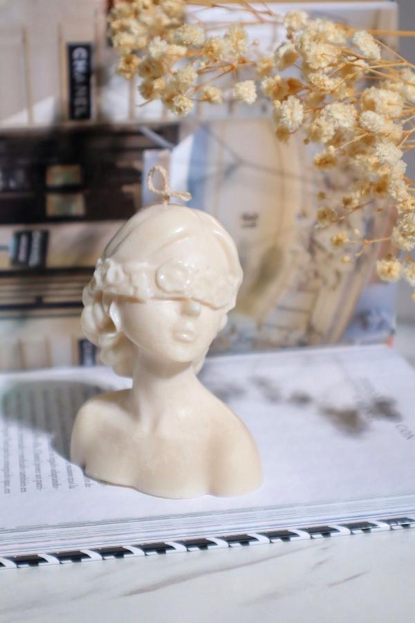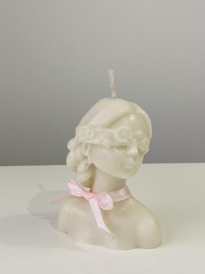 Vela de Mujer con antifaz con diseño misterioso y elegante. Medidas: 8.5cm alto x 7 cm ancho x 5cm Profundidad. Material: cera de soja. Una pieza de diseño único.
