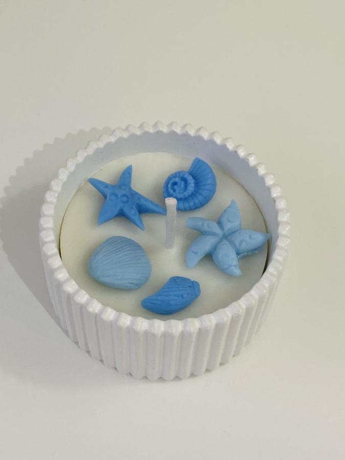 Sentí la brisa marina con esta vela decorada con caracoles y estrellas de mar. Medidas: Base 10 cm x Alto 5cm. Material: Yeso/Cemento y cera de soja. Ideal para decorar ambientes frescos 🐚🌊