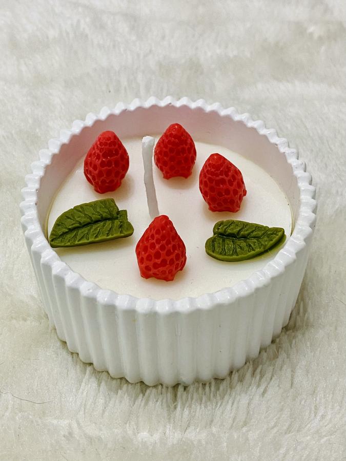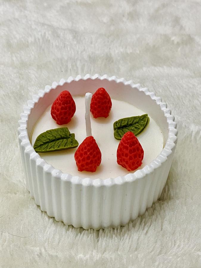 Deliciosa combinación de mini frutillas y hojitas artesanales sobre nuestra base estrella. Medidas: Base 10 cm x Alto 5cm. Material: Yeso/Cemento y soja. Un detalle dulce, colorido y muy original 🍓🍃