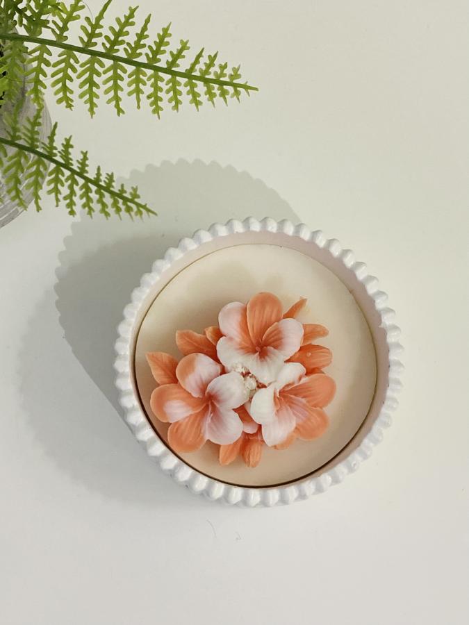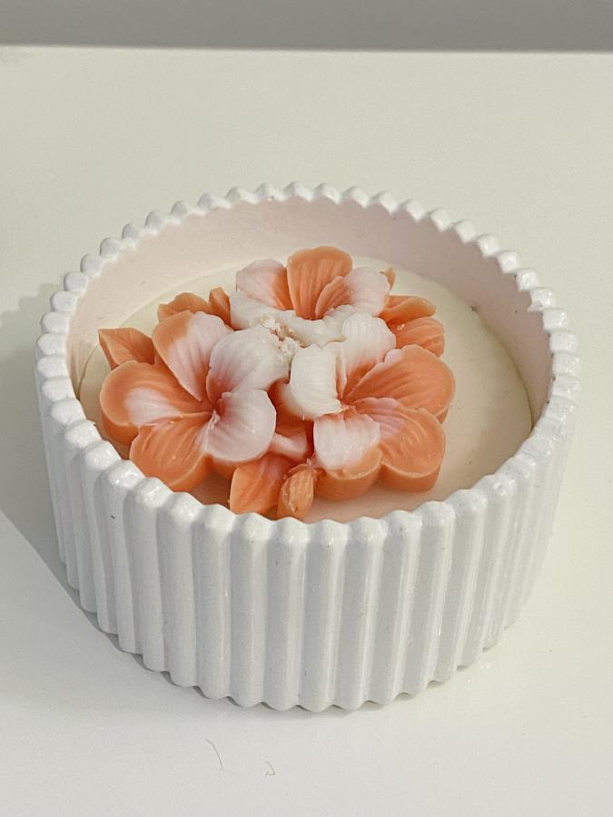 Nuestra clásica base de diseño con una delicada flor de hortensia artesanal encima. Medidas: Base 10 cm x Alto 5cm. Material: Yeso/Cemento y cera de soja. Elegancia y textura en una pieza única 🌸✨