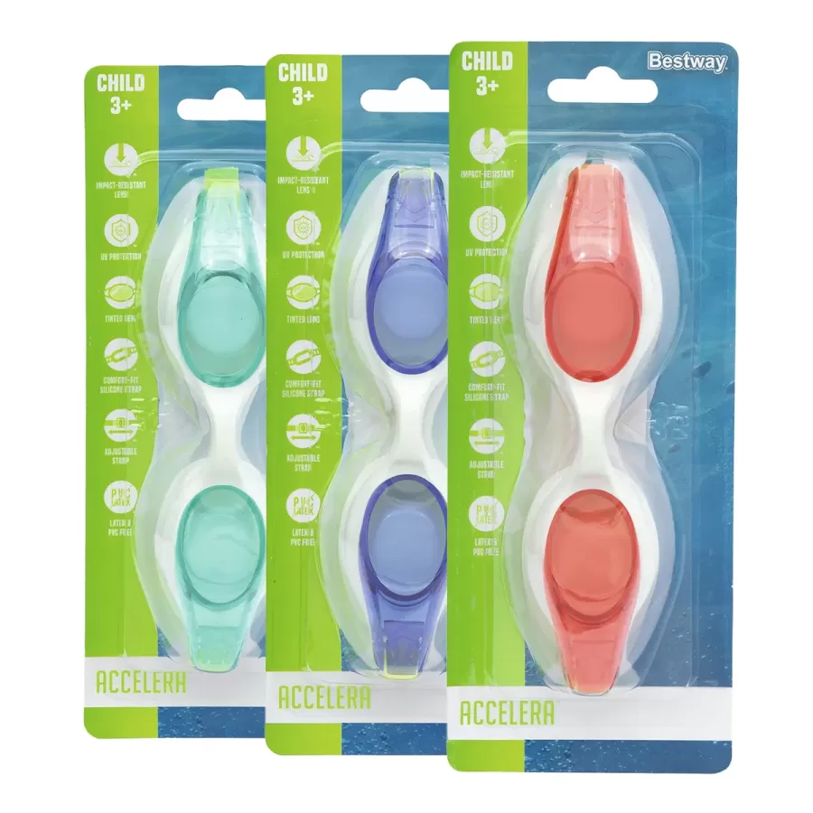 Combina las explosiones de energía de tu peque con un par de Gafas de Natación Bestway® Accelera™. Perfectas para niños a partir de los 3 años, elige el par que se adapte a su energía y dure tanto como ellos.