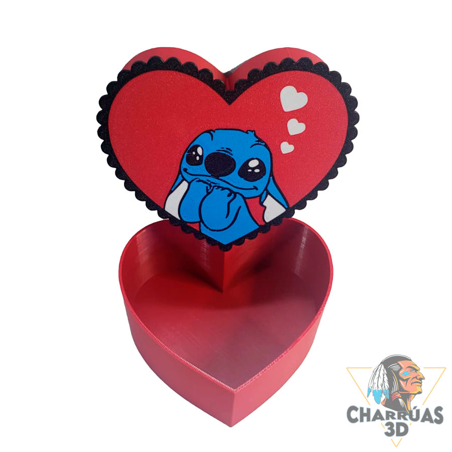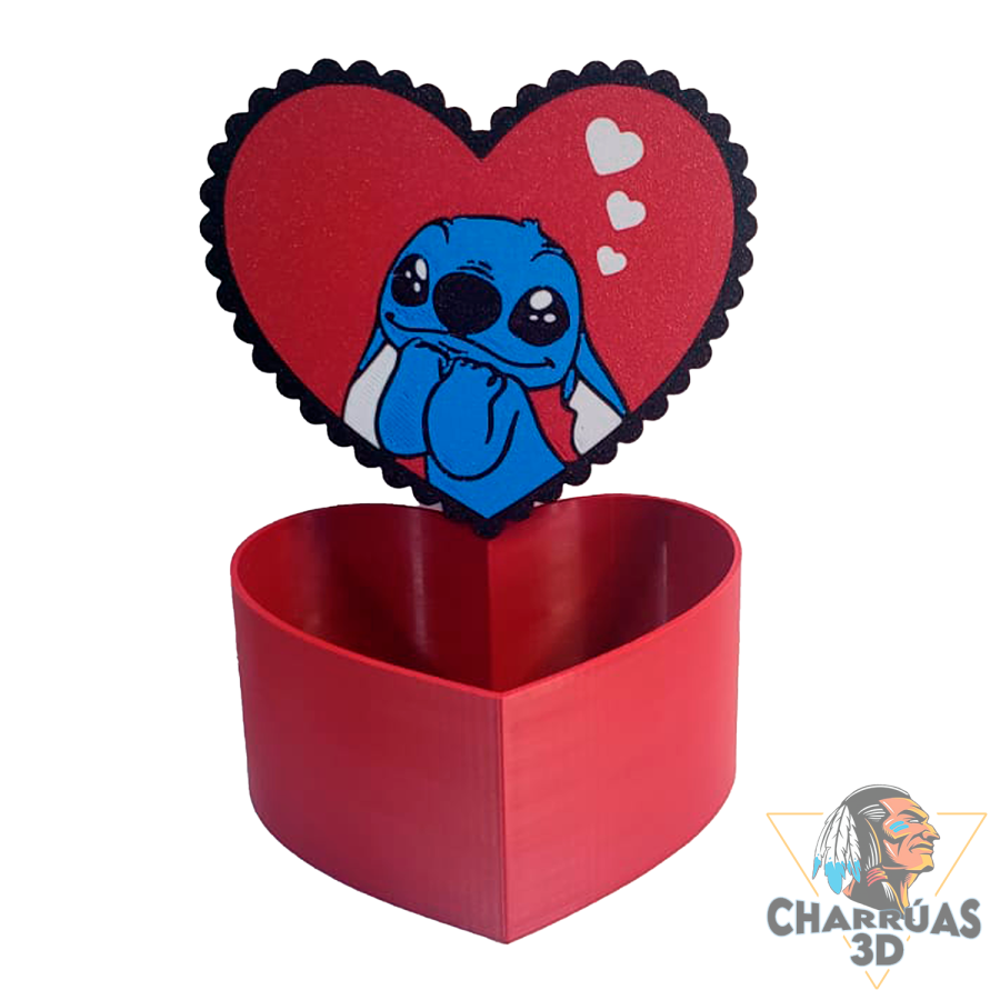 La caja corazón de Stitch es una pieza impresa en 3D con un diseño tierno y llamativo, pensada como un regalo especial para sorprender en fechas importantes o para sumar a una colección temática.