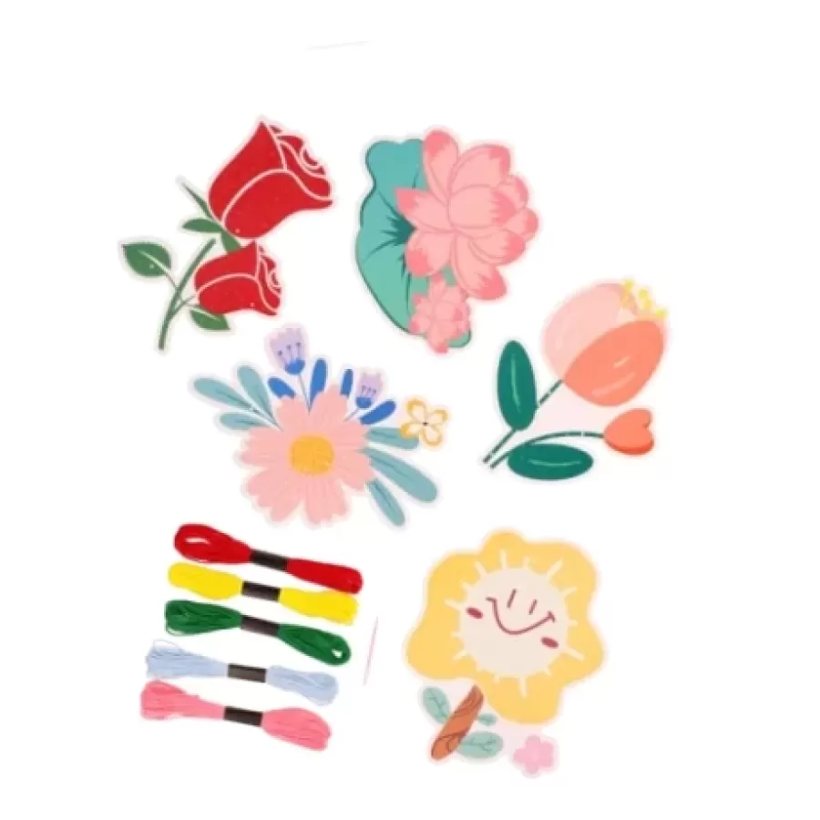 Incluye piezas preperforadas y lanas de colores para bordar animalitos y flores, estimulando la motricidad fina, la concentración y la creatividad 🌈