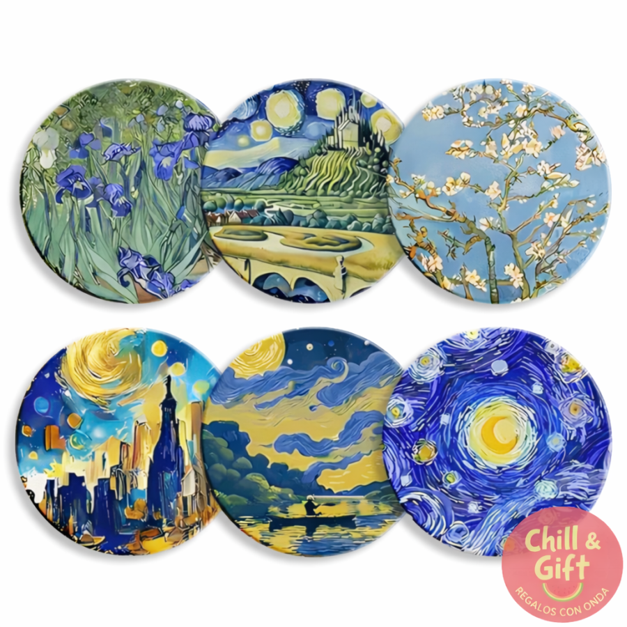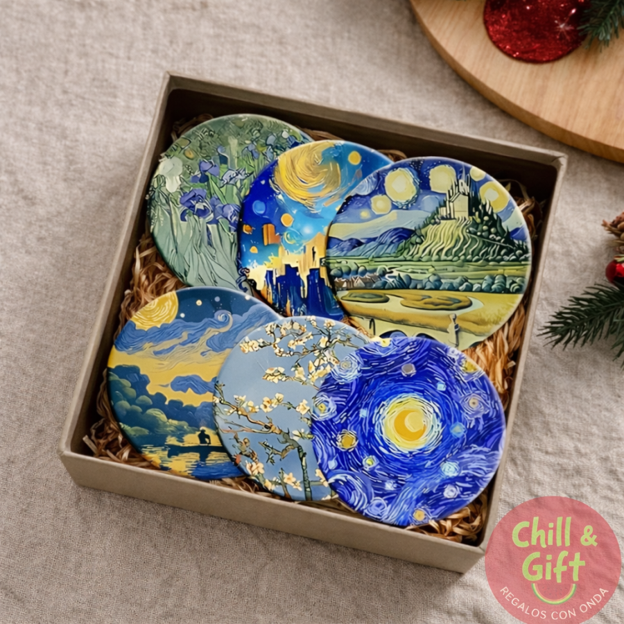 Este set de posavasos artísticos está inspirado en el arte y en esas noches que invitan a bajar un cambio y disfrutar sin apuro. Cada diseño evoca escenas llenas de color, movimiento y emoción, transformando lo cotidiano en un pequeño momento de inspiración.