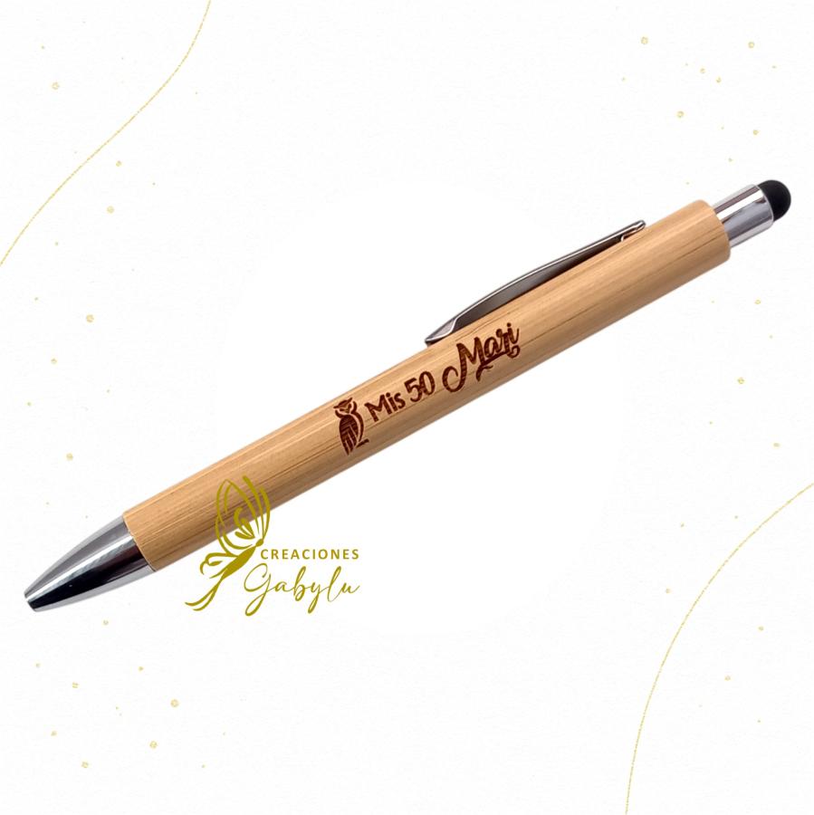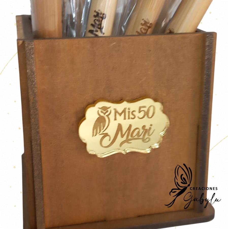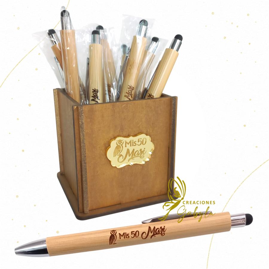 Las lapiceras están personalizadas mediante grabado láser, según el formato que se aprecia en la foto de portada: Ocasión Nombre Fecha. El portalápices en mdf, pintado simil madera, también va personalizado con tag en acrílico espejo.