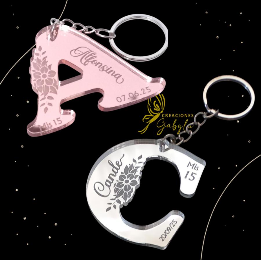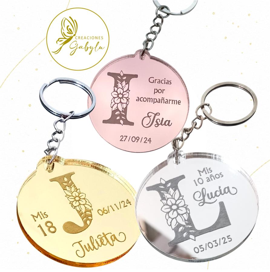 Dos modelos, llavero con la forma de la inicial, o llavero circular con la inicial y flores grabadas.