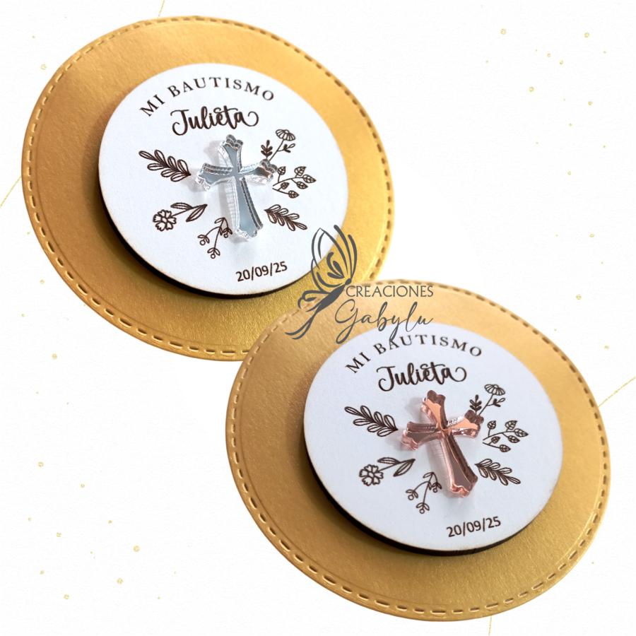 El aplique en forma de cruz está realizado en acrílico espejo 3 mm, disponible en dorado, plateado o rose gold.