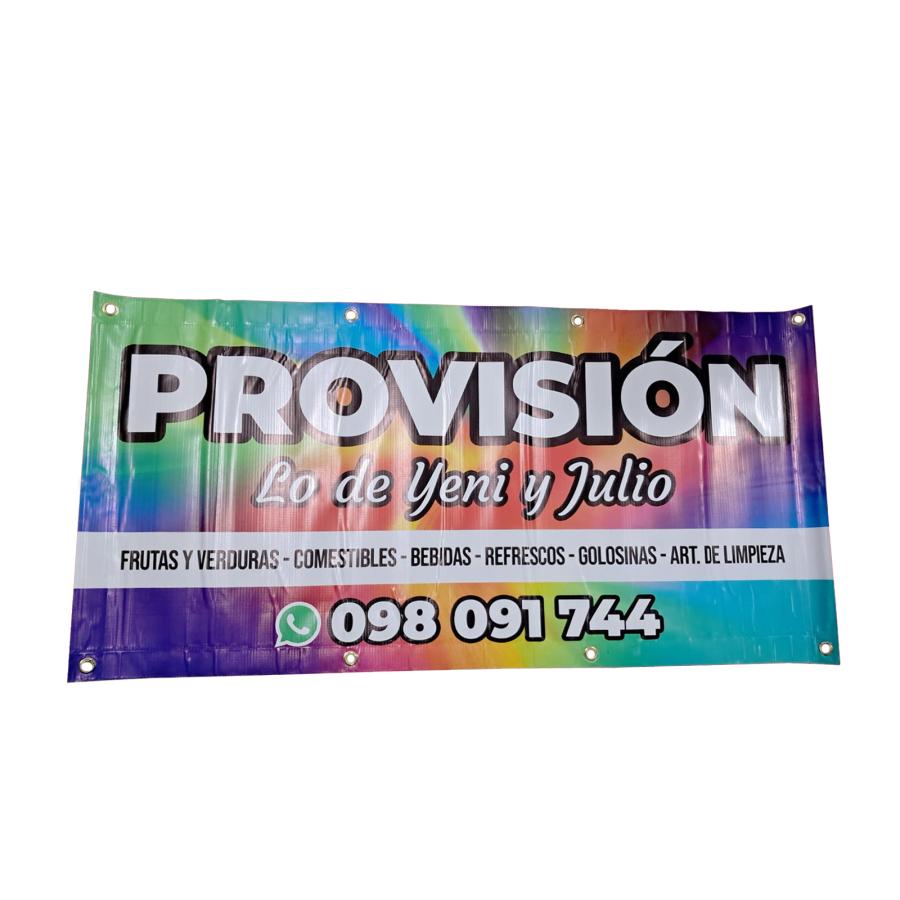 Banner con diseño personalizado. Impresión digital full color sobre lona para interior y exterior, con 8 ojales (distribuidos 4 arriba y 4 abajo). Impreso con tintas UV