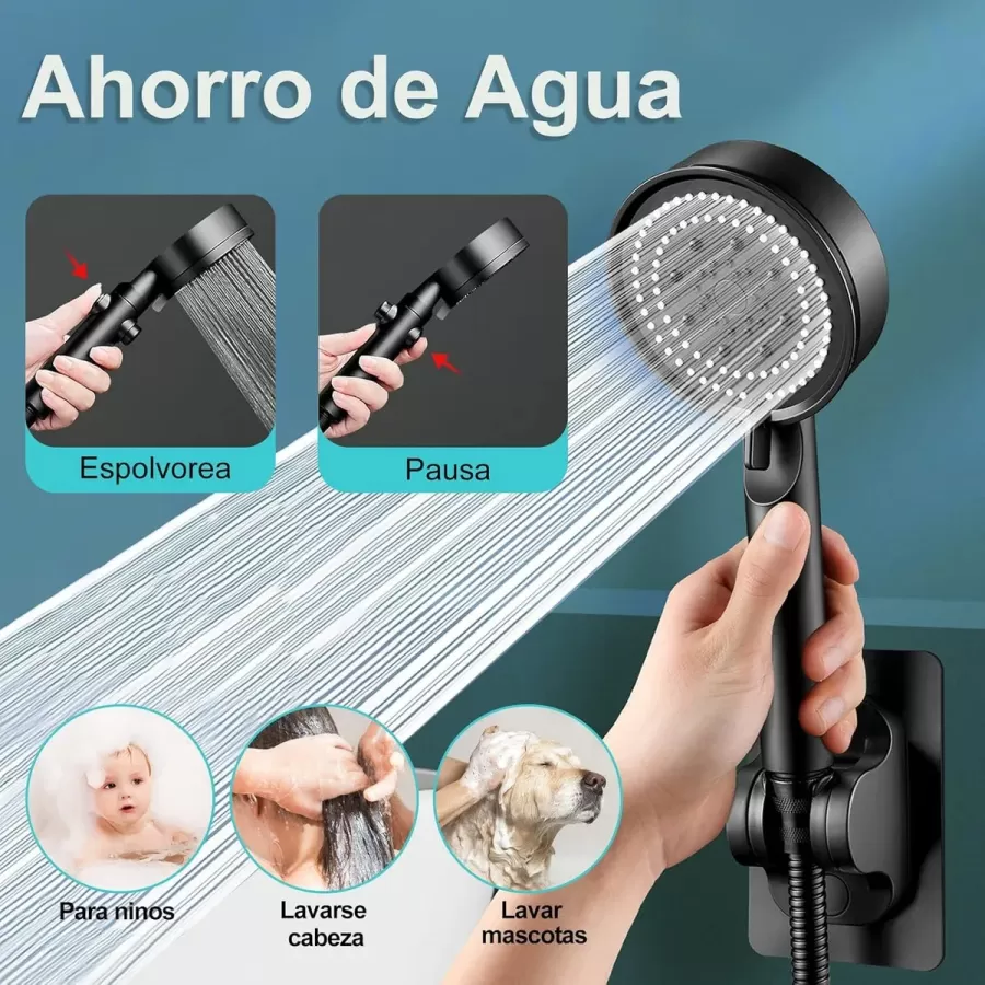 El teléfono duchero está diseñado para brindar una experiencia de ducha versátil y cómoda, gracias a sus cinco modos de pulverización ajustables. Simplemente gira el cabezal para seleccionar el tipo de flujo de agua que prefieras, desde una suave brisa hasta un chorro más fuerte y concentrado. Esta funcionalidad permite adaptar la ducha a tus necesidades diarias, ya sea para relajarte al final del día o revitalizarte por la mañana. Incluye una manguera flexible, lo que te proporciona gran libertad de movimiento. Su diseño flexible previene daños por torsión, incluso cuando sostienes el duchero en la mano, garantizando una mayor durabilidad y facilidad de uso. Una característica destacada es su botón de pausa de agua integrado en el mango, que permite detener el flujo por completo en cualquier momento. Esta función es especialmente útil para situaciones donde necesites ahorrar agua o interrumpir temporalmente la ducha sin ajustar la temperatura o el caudal del agua. Además, proporciona seguridad al poder detener el agua de manera rápida y eficiente. Con su diseño moderno y ergonómico, se adapta a cualquier baño, ofreciendo una instalación sencilla y rápida. ¡Optimiza tu rutina de baño! MEDIDAS MEDIDAS MANGUERA - Largo: 145 cm - Diámetro conexión: 2 cm MEDIDAS CABEZAL - Largo: 9 cm - Ancho: 3 cm - Alto: 24 cm