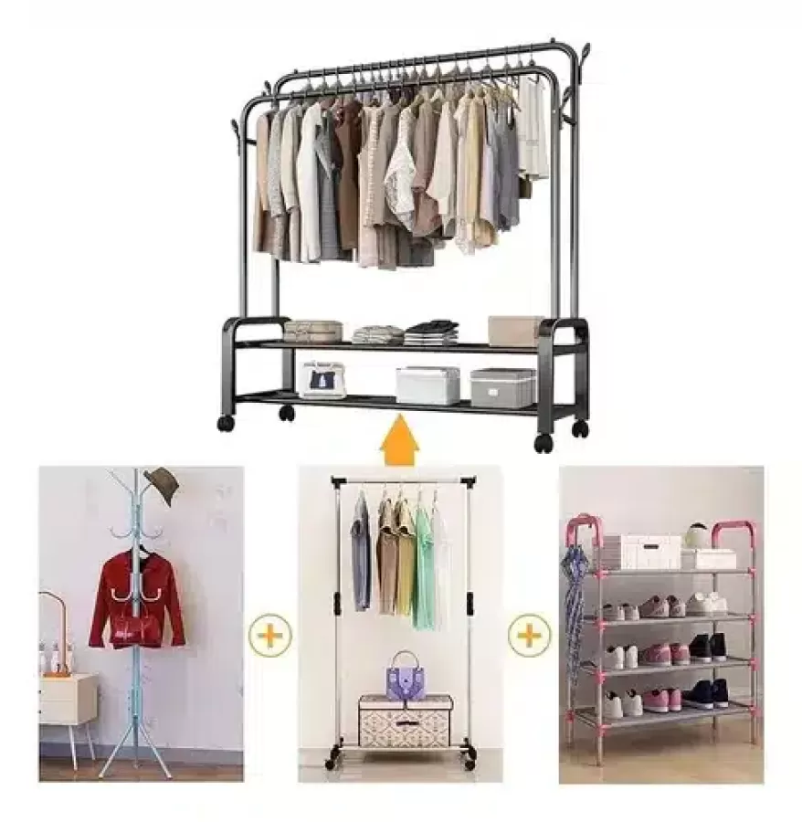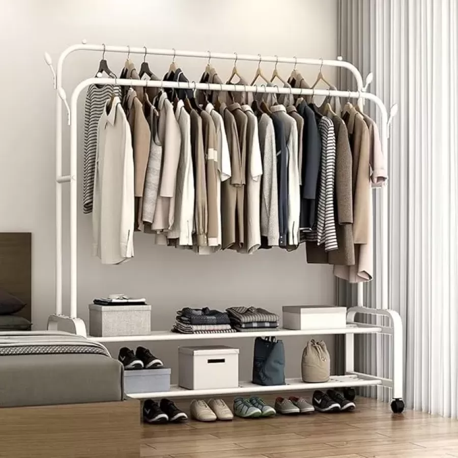 ¡Dale un toque de elegancia y organización a tu hogar con nuestro perchero de metal doble con 2 Estantes y Ruedas! Este versátil y funcional mueble es la solución perfecta para mantener tus prendas y accesorios en orden.