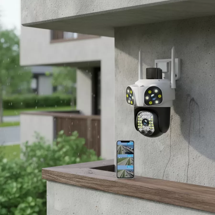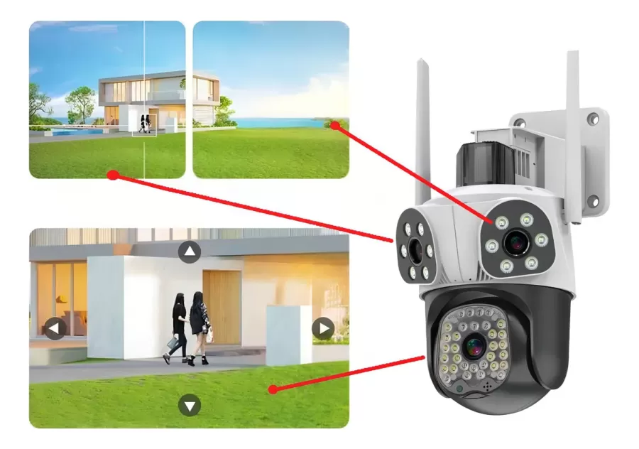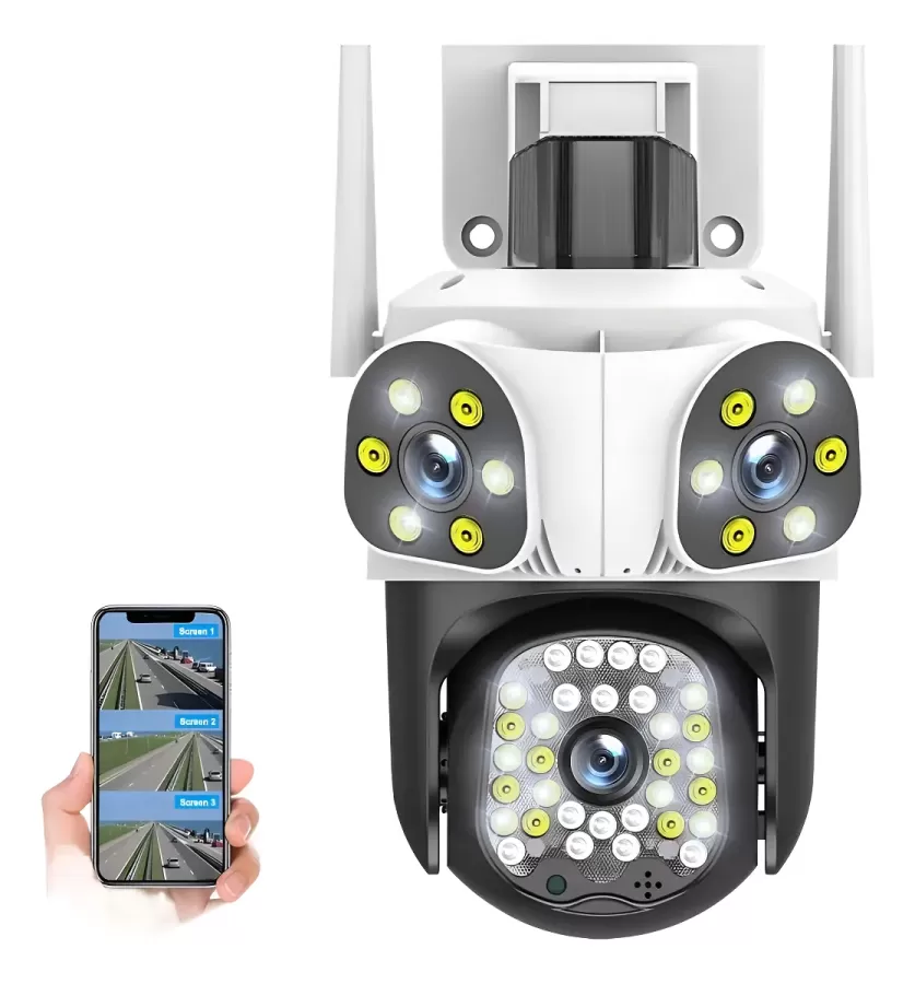 App: iCam365 Una Cámara supera a Tres (2 cámaras tipo bullet 1 domo ptz en la misma Cámara) Monitoreo integral del cabezal, panorámica/horizontal 0-355 grados, vertical 0-90 grados. IP66 resistente al agua, Admite tanto conexión WiFi 2.4Ghz (no WiFi 5G) como de cable de red RJ-45 Cámara wifi de 2MP con tres lentes y tres pantallas para el monitoreo en tiempo real y simultáneo de las tres cámaras. El primer y segundo cuadro es la cámara en una posición fija. El tercer cuadro es la cámara PTZ. Seguimiento automático: después de bloquear el objetivo, la cámara de video ajustará la rotación de giro/inclinación automáticamente, rastreando objetos en movimiento. Esta cámara de seguridad nunca le permitirá perderse ningún momento importante. Visión nocturna con doble luz: cuenta con luces LED blancas y LED infrarrojos incorporados. Monitoriza objetos en movimiento e ilumina automáticamente. La cámara muestra una vista colorida incluso de noche, con tres modos nocturnos para elegir que se pueden cambiar libremente a través de la aplicación.