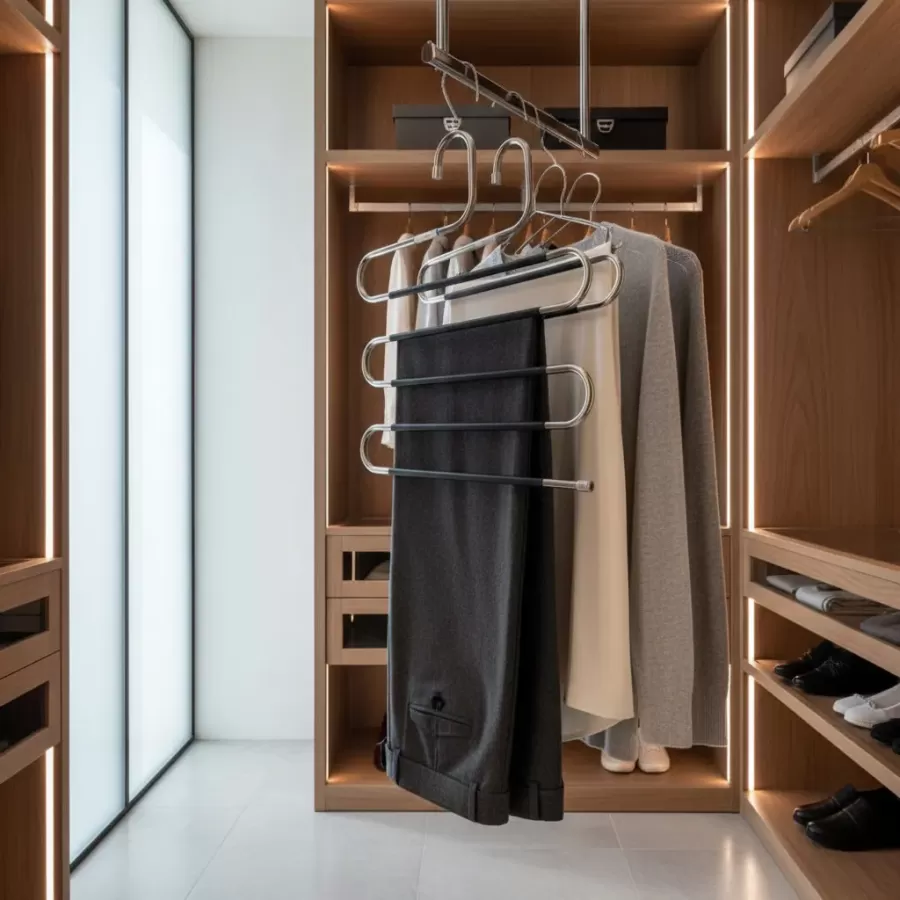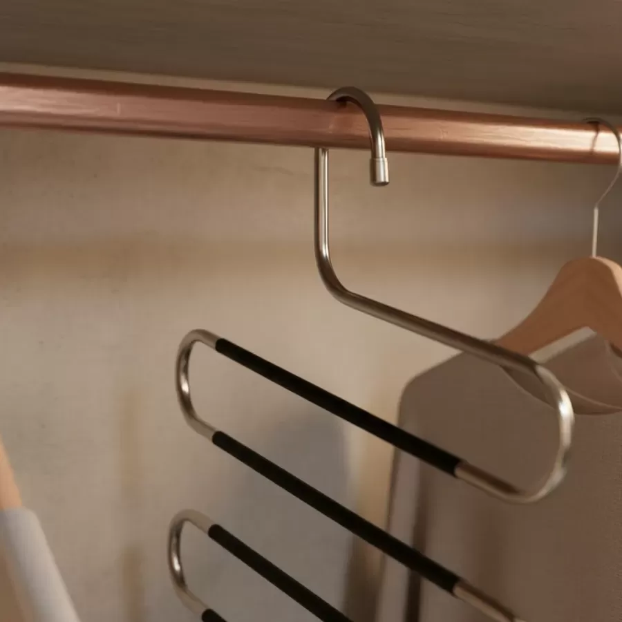 Optimiza el espacio de tu armario con esta percha múltiple para pantalones, ideal para organizar hasta 5 prendas en un solo lugar. ESPECIFICACIONES - Capacidad para 5 pantalones. - Medidas: 36 x 33cm - Estructura de acero inoxidable resistente y duradera. - Diseño en forma de S para fácil acceso y ahorro de espacio. - Secciones recubiertas para evitar deslizamientos y proteger la ropa. - Material: acero inoxidable y goma antideslizante RECOMENDACIONES Perfecta para mantener tus pantalones ordenados y sin arrugas. Ideal para armarios pequeños o para quienes buscan maximizar el espacio disponible. FÁCIL DE USAR Solo cuelga la percha en tu armario y coloca los pantalones en cada nivel. El gancho superior permite colgarla en cualquier barra estándar.