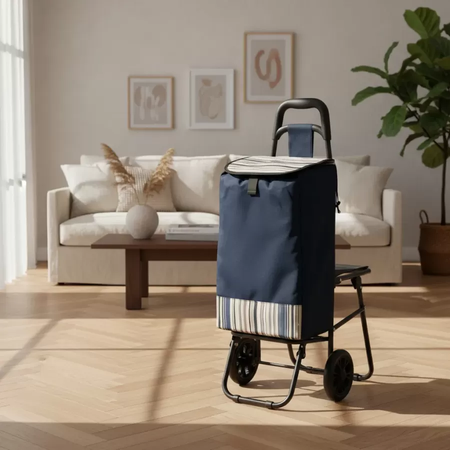 Fabricado con estructura metálica liviana pero resistente, este carrito se adapta a distintas superficies gracias a sus ruedas firmes. La bolsa espaciosa permite transportar frutas, verduras, compras diarias o incluso artículos personales. Una opción versátil y práctica para el día a día.
