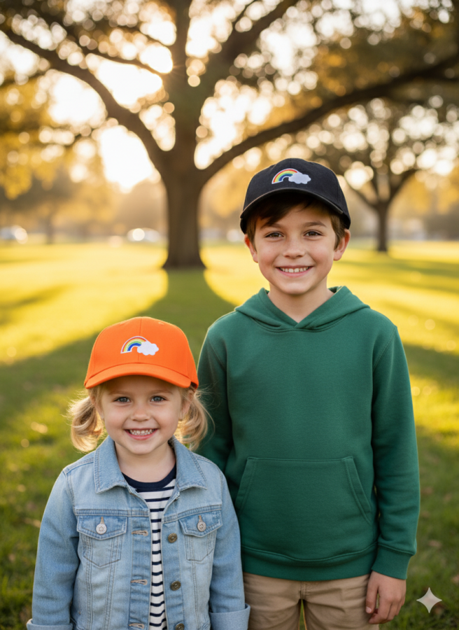 Gorro de niño con arcoiris y gorro de adolescente de color blanco y rojo.