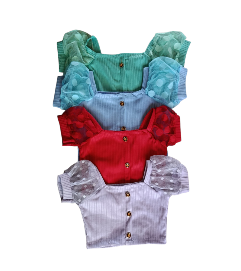 El top tiene mangas con tul en colores lisos desde el talle 2 al talle 8.