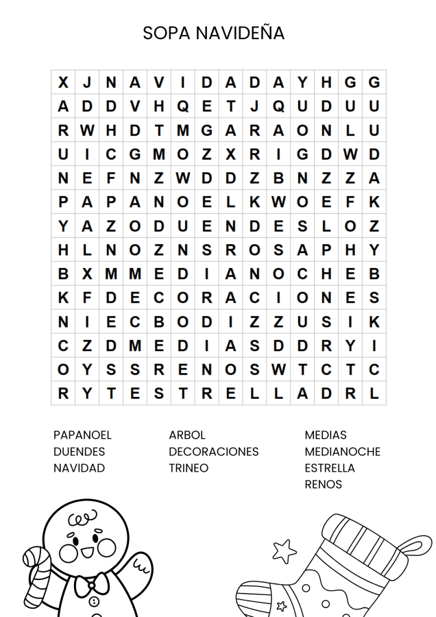 Un divertido cuadernillo para vivir la magia de la Navidad aprendiendo y jugando. Incluye una sopa de letras navideña, actividades para terminar dibujos, ayudar a Papá Noel a salir del laberinto y llegar al trineo, colorear según número, decorar borlas y árboles, ¡y hasta escribir una carta a Papá Noel! 💌