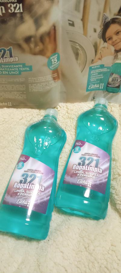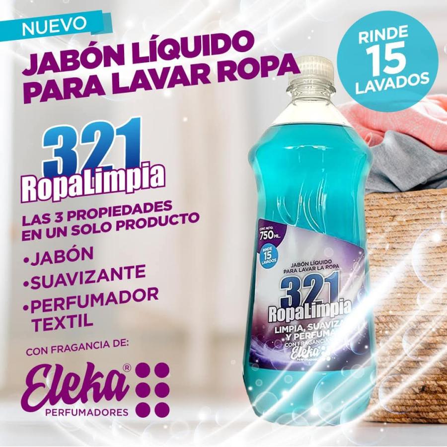El 321 Ropa Limpia combina jabón, suavizante y perfumador textil en un solo producto. Deja las prendas limpias, suaves y con un aroma fresco y duradero.