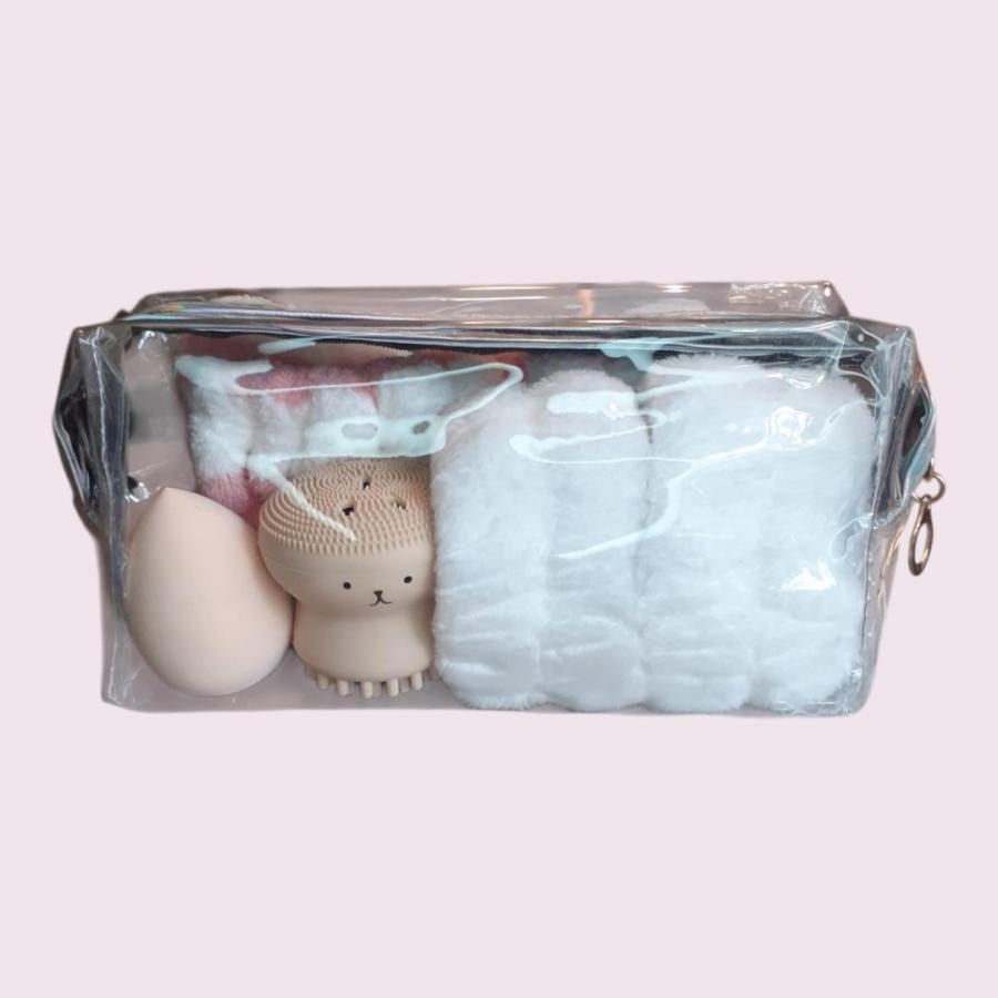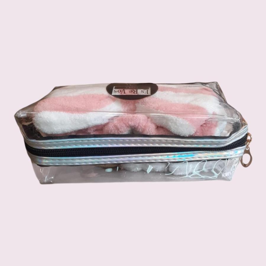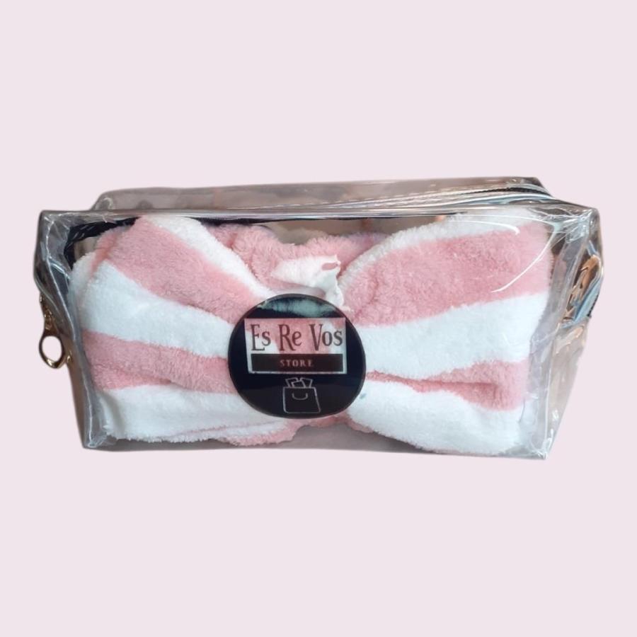 Kit para rutinas de limpieza o maquillaje. El mismo contiene una vincha elástica con moña para su mejor adaptación. Con opción de diseño a rayas o animal print.