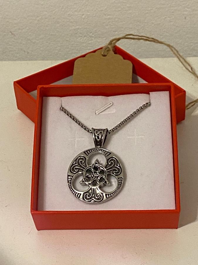 Colgante estilo celta "triqueta", un símbolo clásico asociado a unión y eternidad. Dije calado en tono plata.