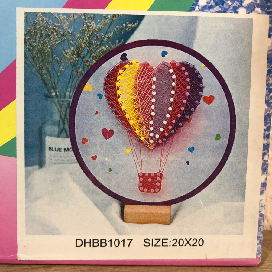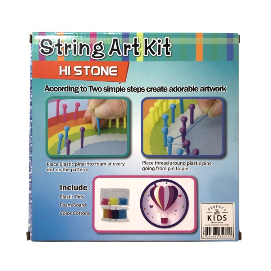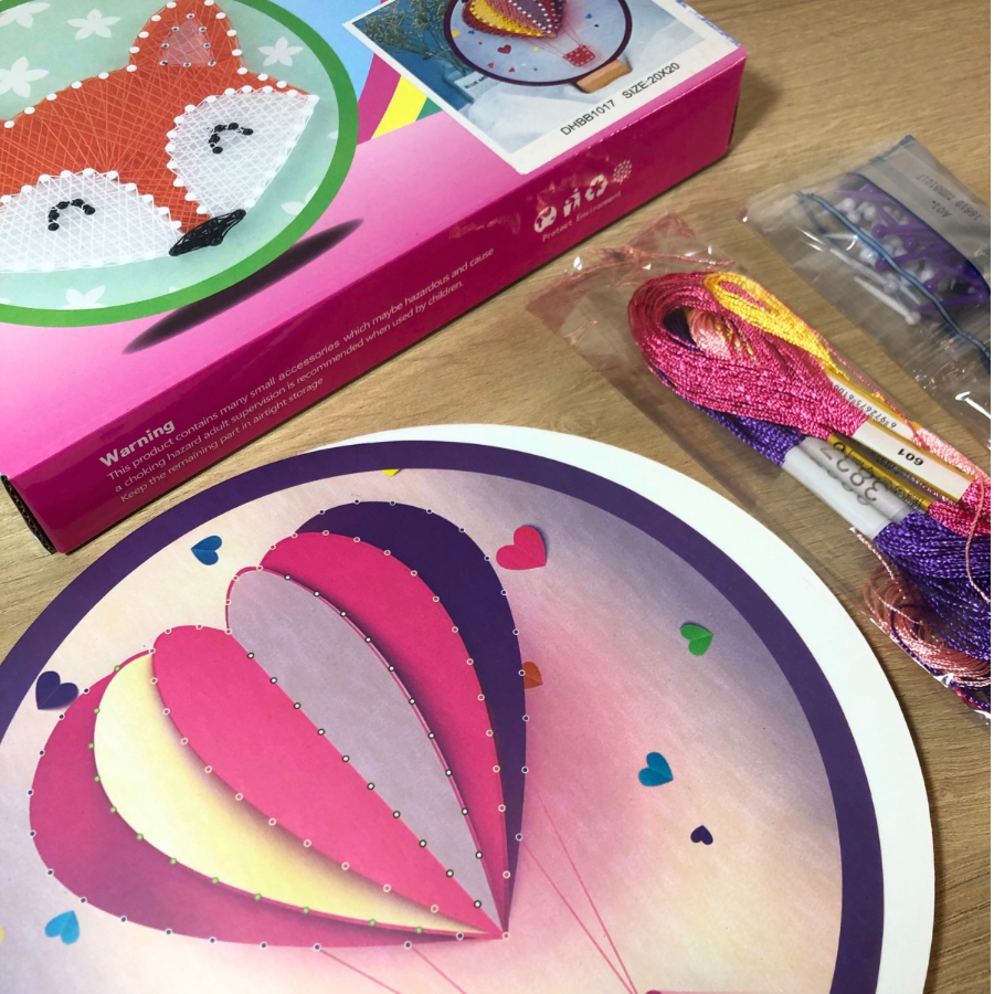 -Incluye base de goma eva 1 cm aprox, clavitos plásticos de colores, hilos de colores y diseño